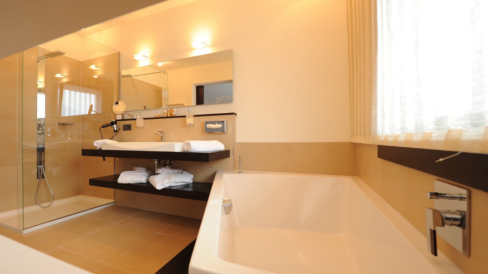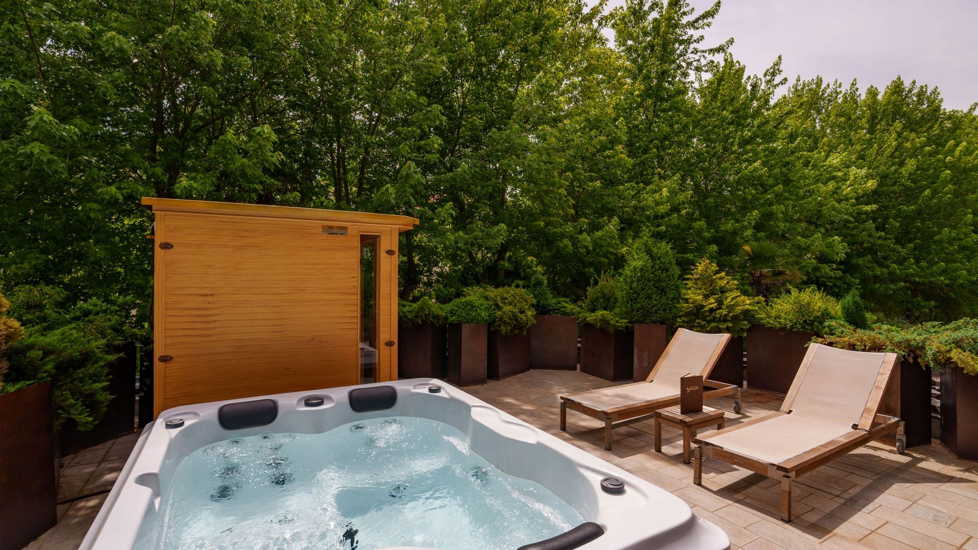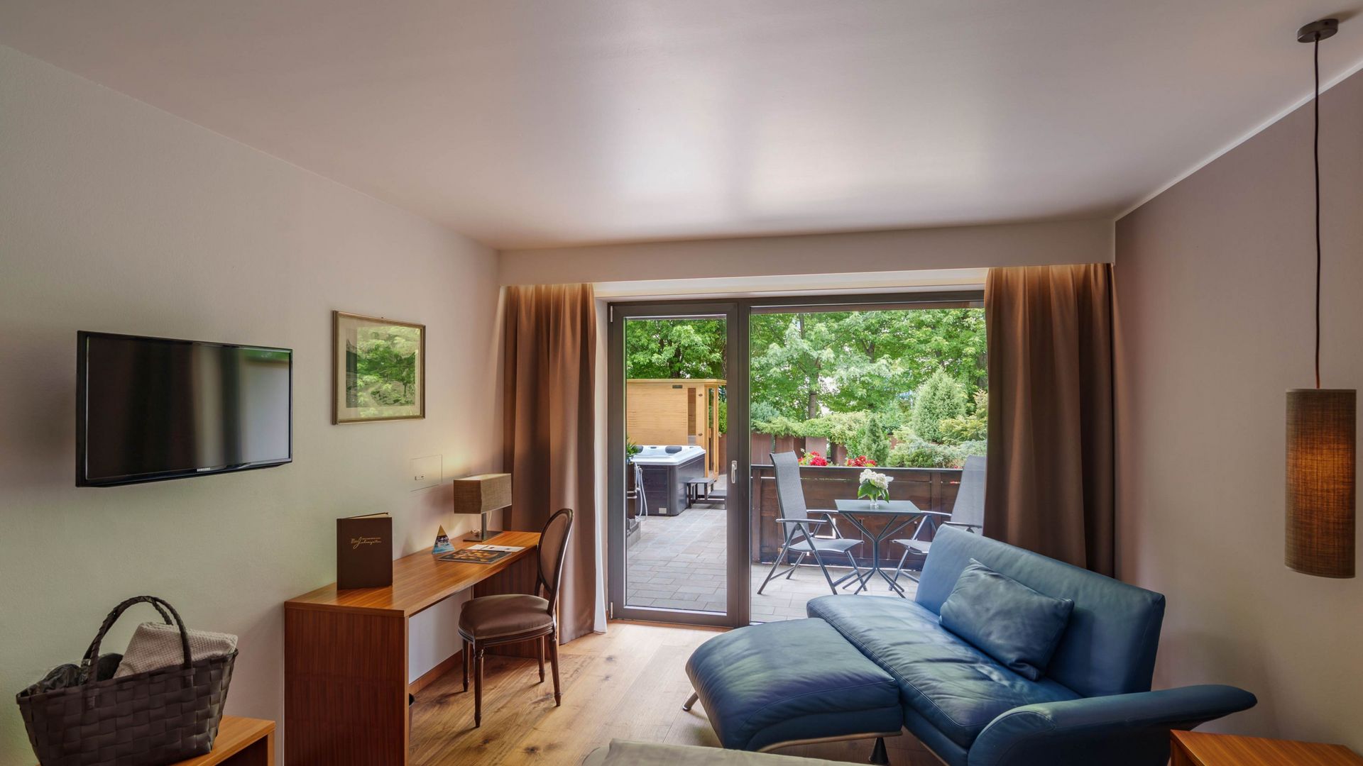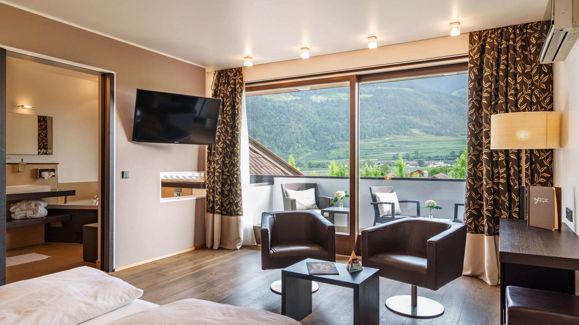 Richtung Ortlermassiv und Gartenlandschaft, Terrasse mit privatem Jacuzzi und privater Infrarotkabine, Nachmittagssonne, gratis WLAN