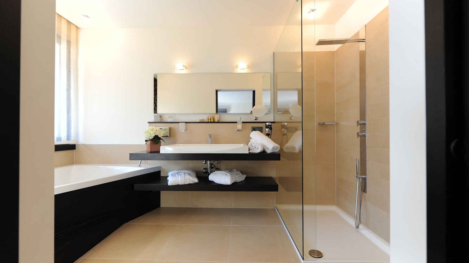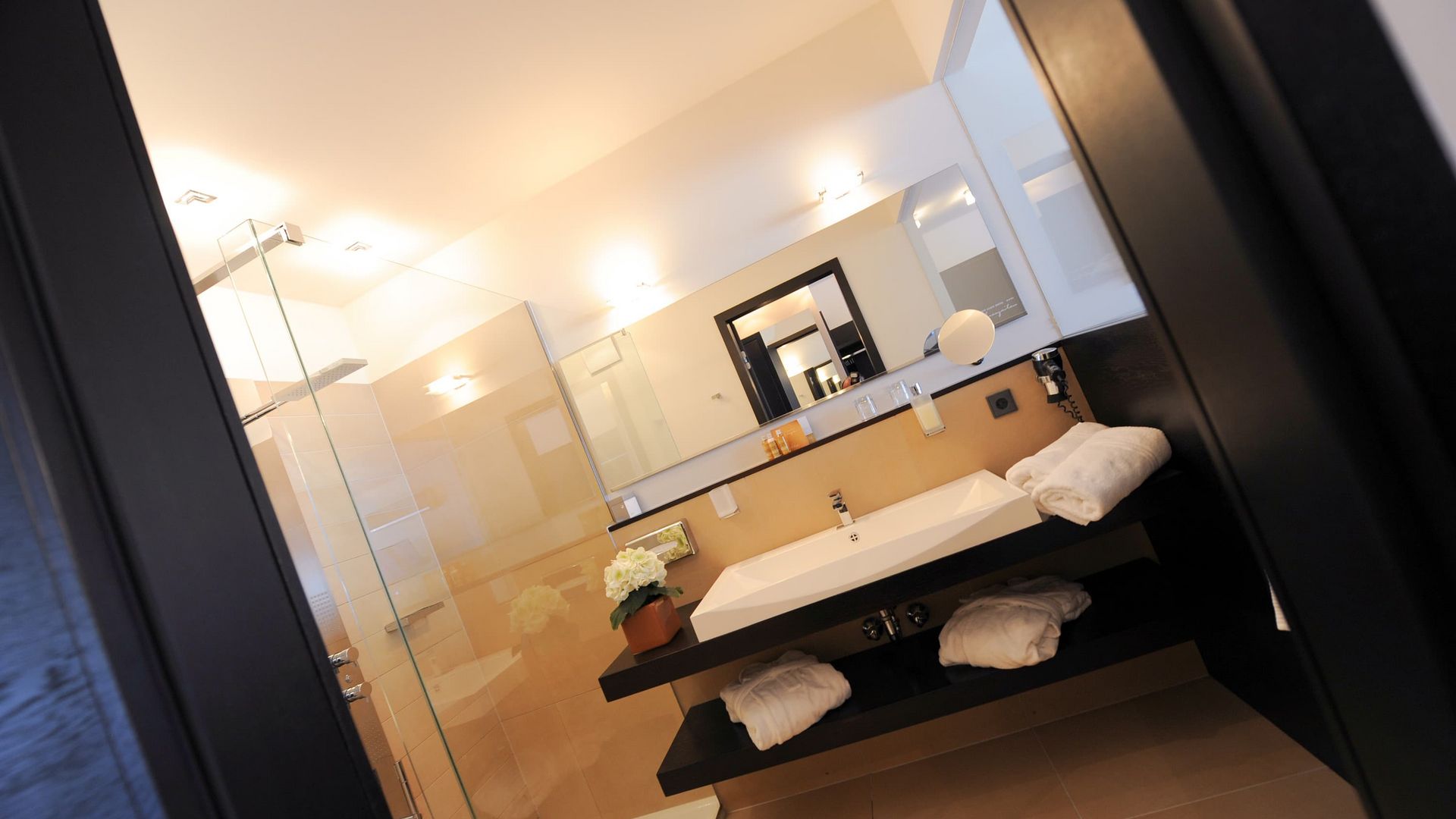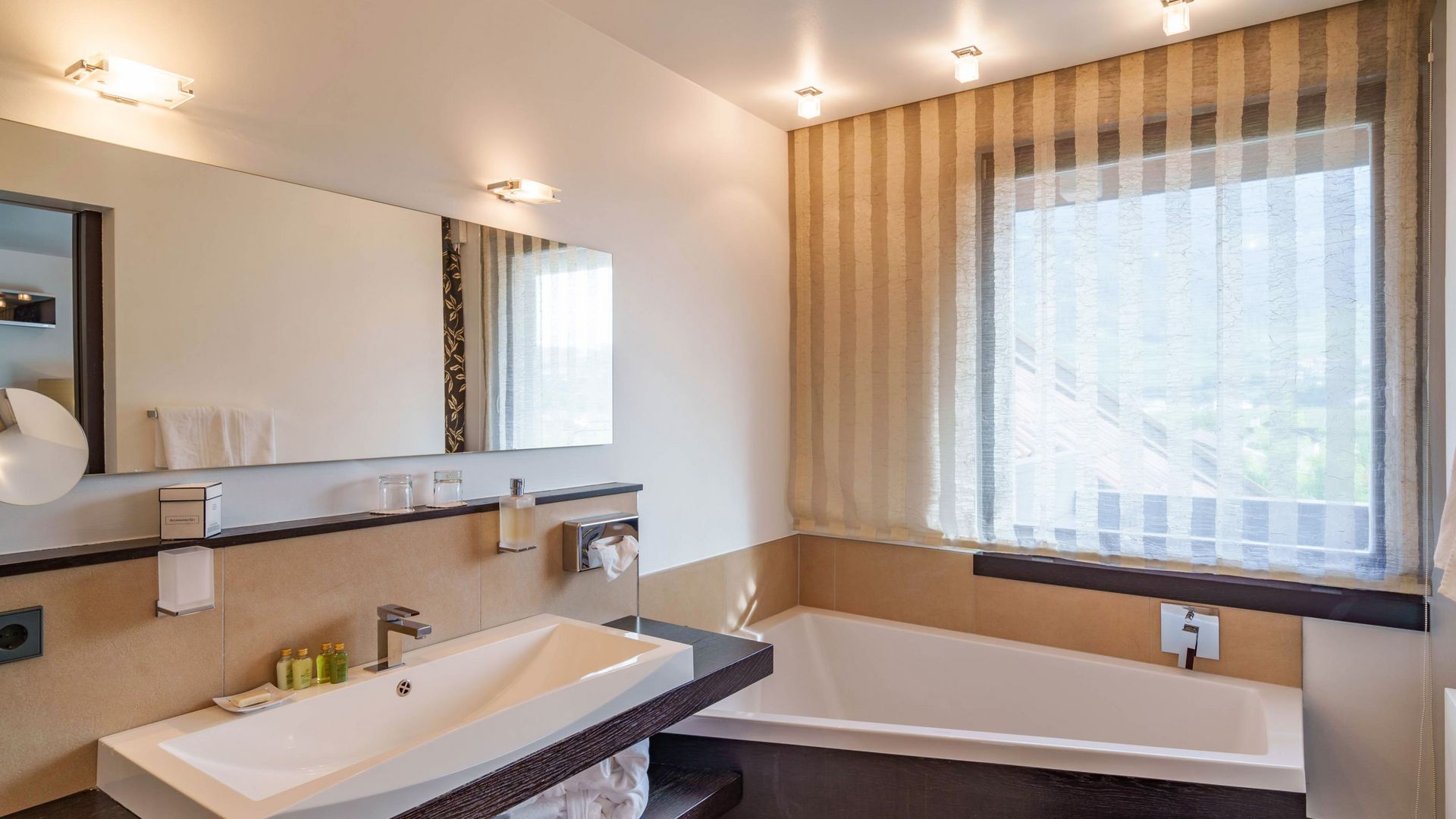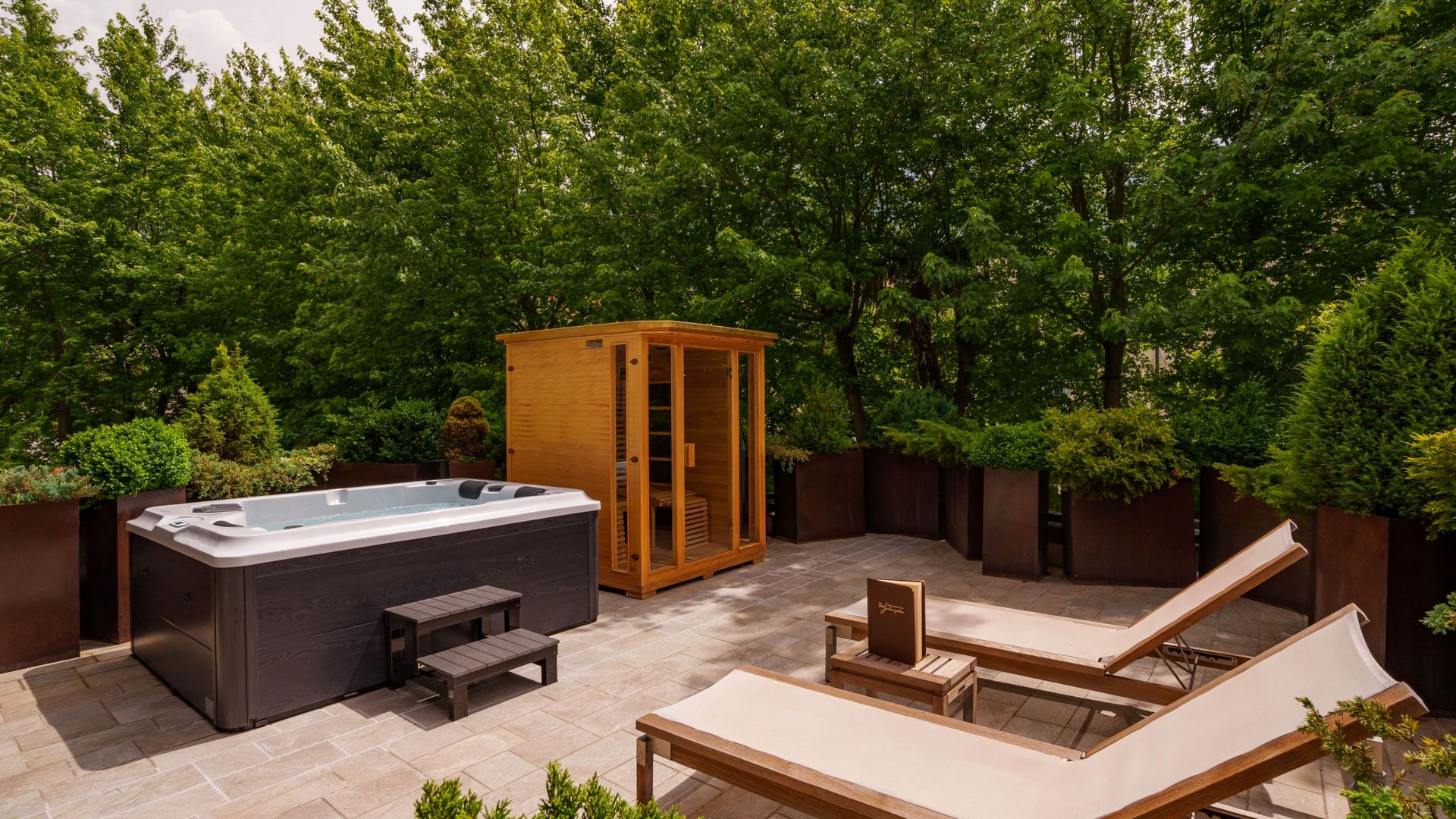 Richtung Ortlermassiv und Gartenlandschaft, Terrasse mit privatem Jacuzzi und privater Infrarotkabine, Nachmittagssonne, gratis WLAN